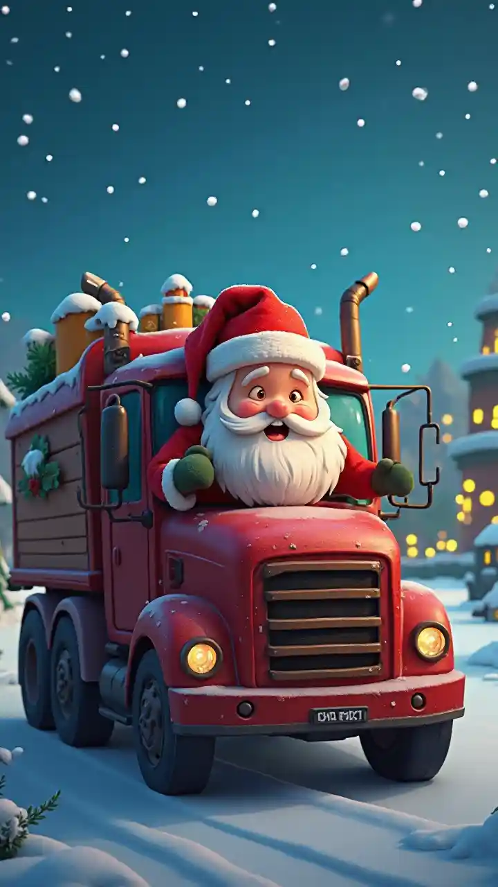 Animiertes Bild des Weihnachtsmanns am Steuer eines Lastwagens
