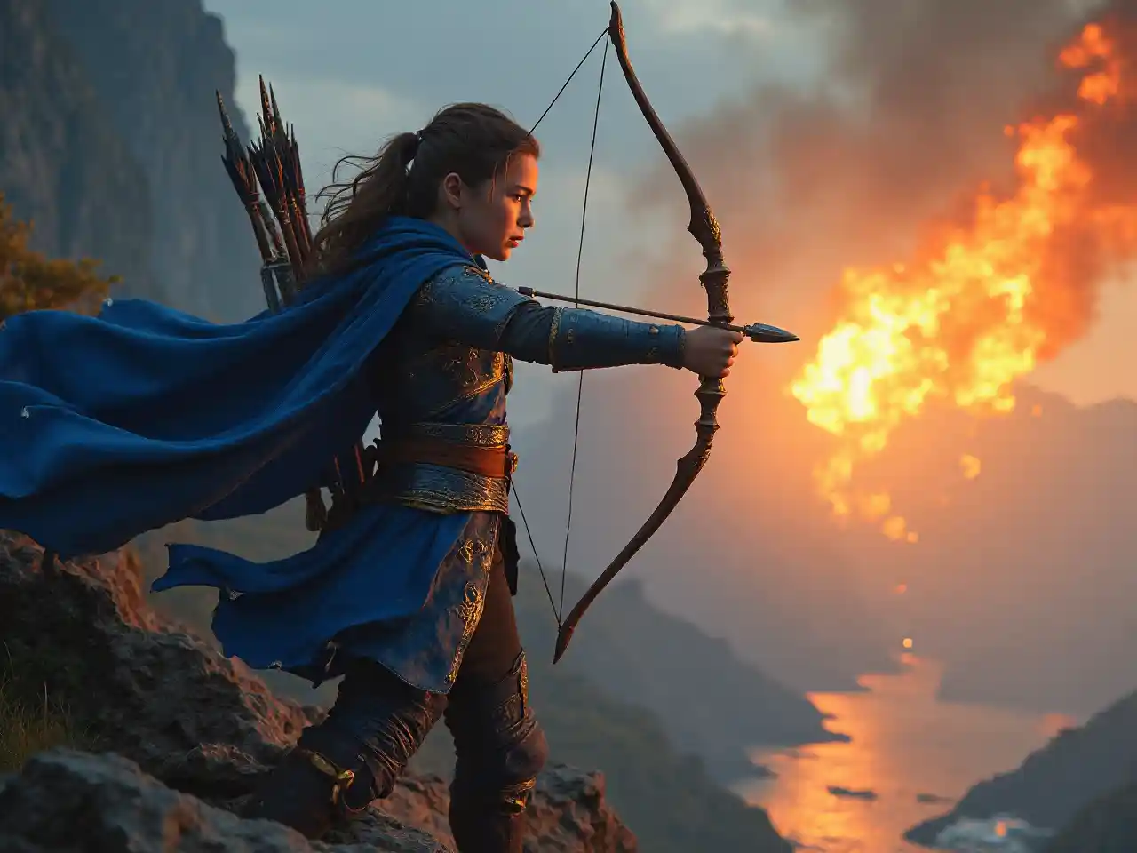 14-jährige Frau trägt Saphir-Rüstung, hält Saphirpfeil und -bogen mit Narben und bereitet sich darauf vor, von der Klippe zu starten