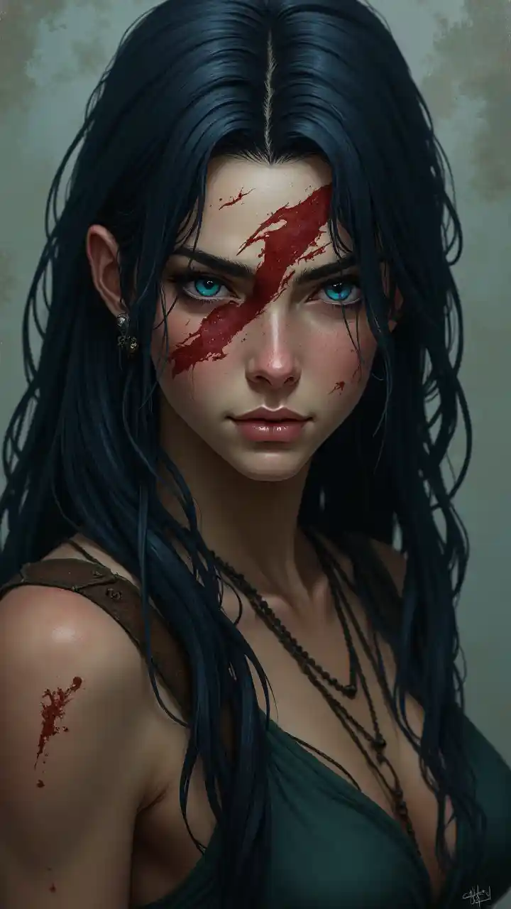 AlexanderHalbork, Weibchen, Narben im Gesicht, blaue Augen, lange dunkle Haare, Krieger