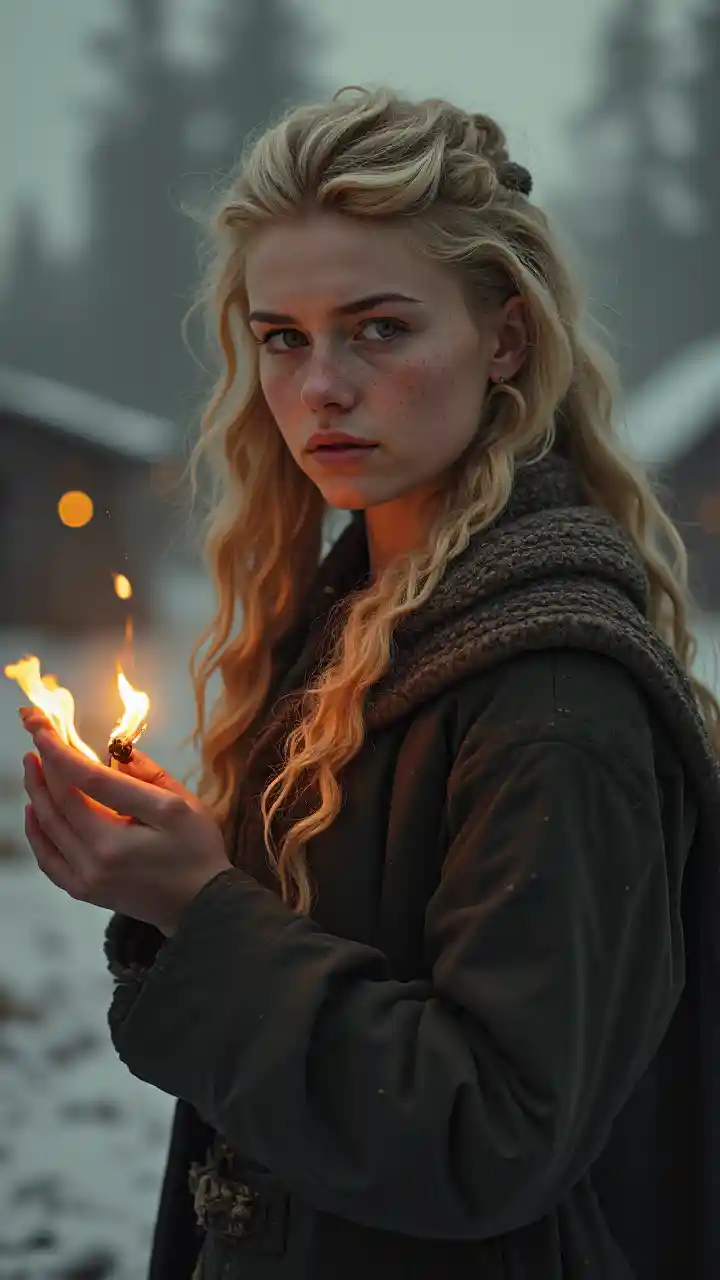 Wir leben in den 1910er Jahren in Finnland, in einem kleinen Dorf in Lappland. Unsere Figur ist Selma, 22 Jahre alt. Selma hingegen hat das Erscheinungsbild ihres Vaters geerbt - kantig, gemein und schrill. Selma hat blonde Haare, ist lang, buschig und wellenförmig. Sie hat graue, mandelförmige Augen. Sie ist blass und hat Sommersprossen wie die meisten Finnen. Viele finden sie hässlich. Das ist ihr egal. Stellen Sie sich Selma in einer Szene vor, in der ihr Dorf brennt. Selma trägt Männerkleidung, weil sie beabsichtigt, später in der Nacht aus ihrer Familie zu fliehen, und Männerkleidung ist bequemer zu reiten. Selma ist ein wütender Mensch, der immer eiskalt, irritiert und streng schaut. Sie ist arm, daher ist ihre Kleidung unvollständig. Selma ist für die Frau recht hoch, hat aber trotzdem einige weiche Rundungen. Mach sie nicht schön. Sie sieht sehr durchschnittlich aus. Außerdem ist Selma eine Hexe. Hintergrund soll ihr Dorf brennen, und Selma soll eine kleine Flamme in der Hand oder in den Fingern halten, denn sie ist eine Feuerhexe.