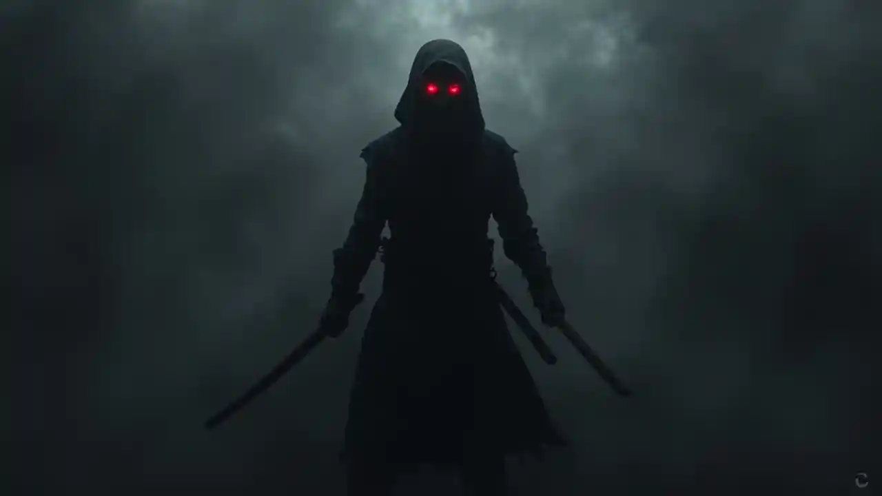 Erstellen Sie ein dunkles, geheimnisvolles Ninja-Bild, das vollständig aus Schatten besteht, ohne sichtbare Gesichtszüge außer leuchtenden roten Augen. Die Figur soll geschmeidig und unsichtbar sein, in eine dunkle, minimalistische, aber dynamische Haltung eingebunden sein. Der Hintergrund sollte matt oder rauchig sein, um den Kontureffekt zu verstärken und den Kontrast der roten leuchtenden Augen zu betonen.