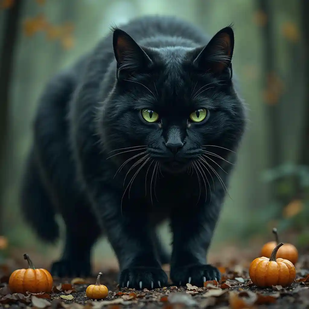 Eine riesige schwarze Katze mit kräftig grünen Augen und Fell scheint sich mit Schatten zu vermischen. Er befindet sich in der Position des Trackens, mit großen und scharfen Pfoten, umgeben von ausgestreckten Zaubersymbolen und kleinen Kürbissen auf dem Boden.