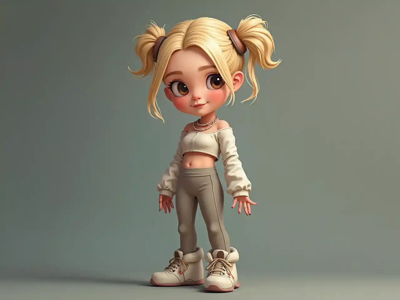 KennedyGanz kurzes weißes Mädchen, blonde Haare, Space-Dampfbrötchen, rotes Gesicht, braune Augen, leuchtende Leggings, bauchfreies Top, Vollaufnahmen