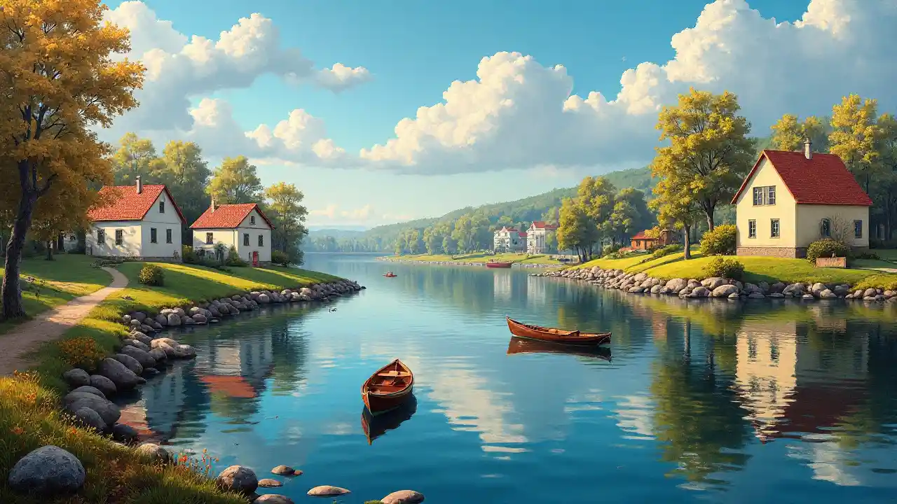 GiselleOleg Shuplyaks Gemälde, optische Täuschungen, im Stil von Oleg Shuplyak, mehrere Bilder in einem, Landschaften, Porträts, Boote, Bäume, Vögel, Häuser