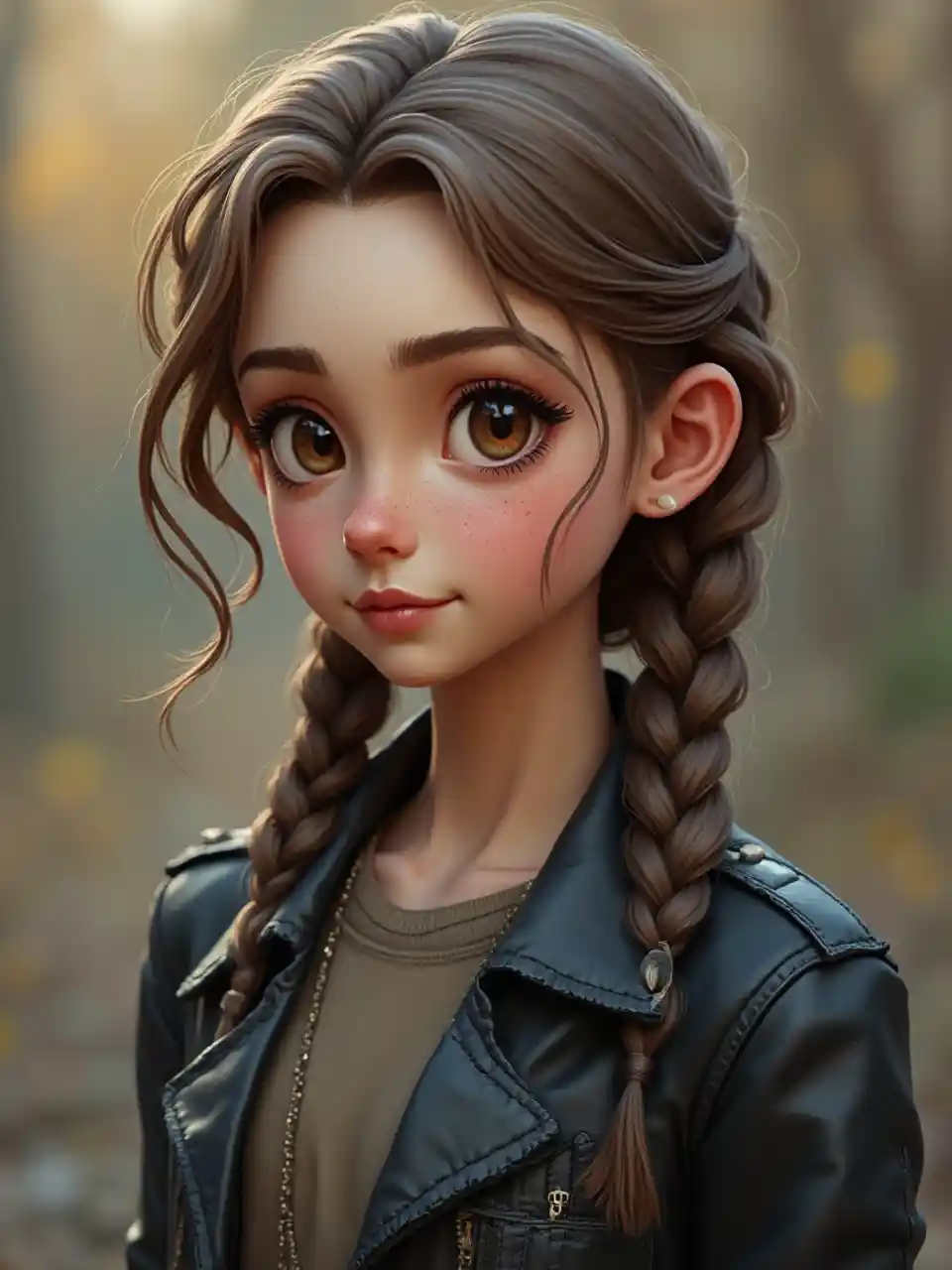 JoannaSiebzehnjährige Frau, hellbraune Haare, Zopf, Sommersprossen, braune Augen, Lederjacke, kleine Figur, mittelgroße Figur, schüchternes Lächeln