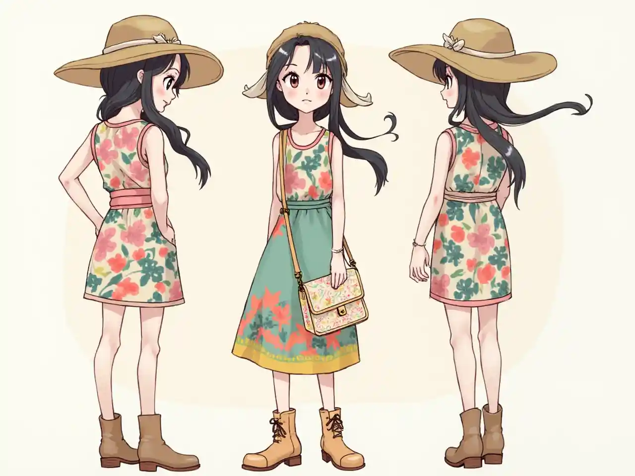 Siena ist ein 13-jähriges, stilvolles Mädchen mit langen, dunklen Haaren und hohem Pferdeschwanz. Sie trägt einen energiegeladenen Hosenträger mit breiter Kantenmütze vor der Sonne. Abgerundet wird ihr Look mit Stiefeletten und mit australischen Mustern verzierten Umhängetaschen.