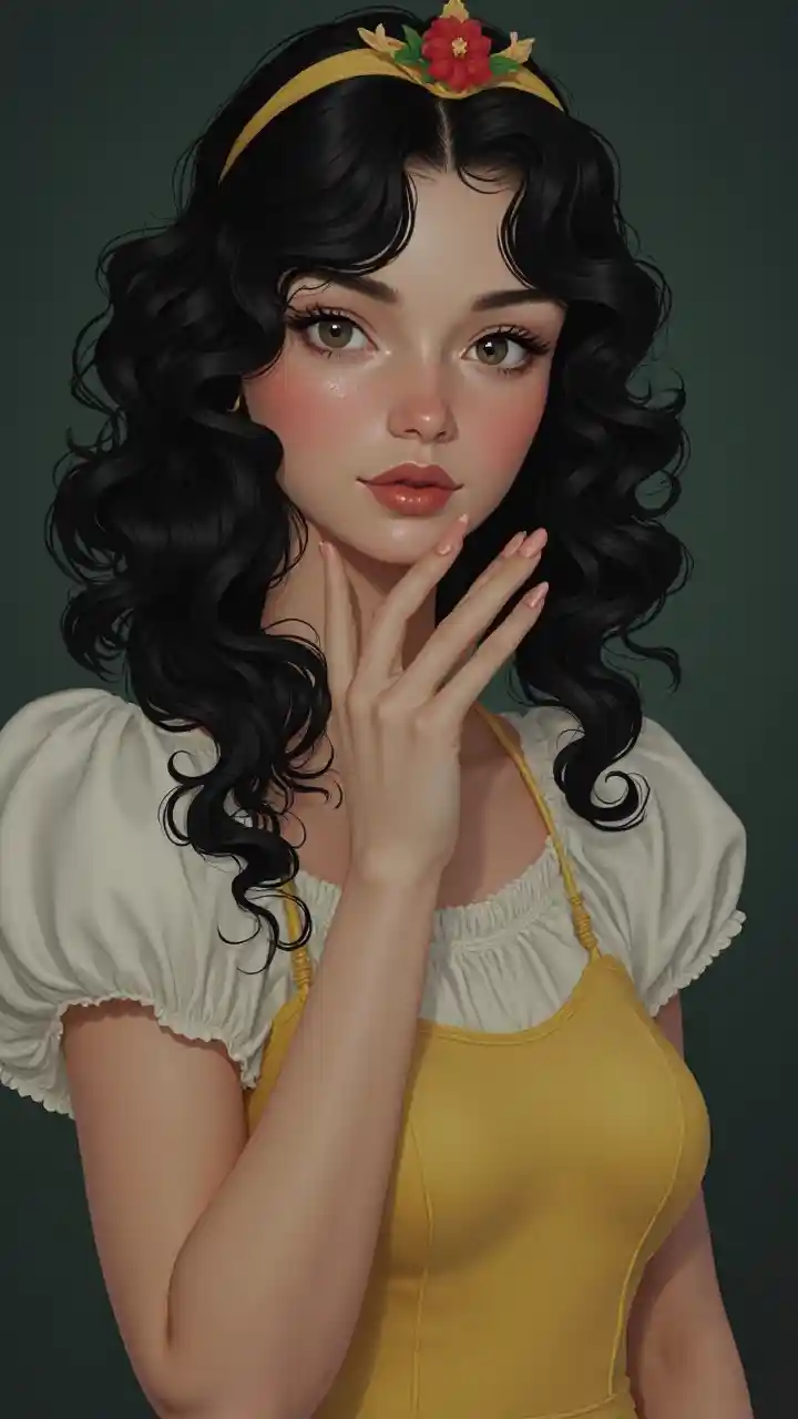 MwangSchönes Mädchen, Prinzessin, sehr blass, schwarze Locken und schwarze Augen, Schneewittchen, 30er-Jahre-Style, Disney Cartoon zum Leben erweckt
