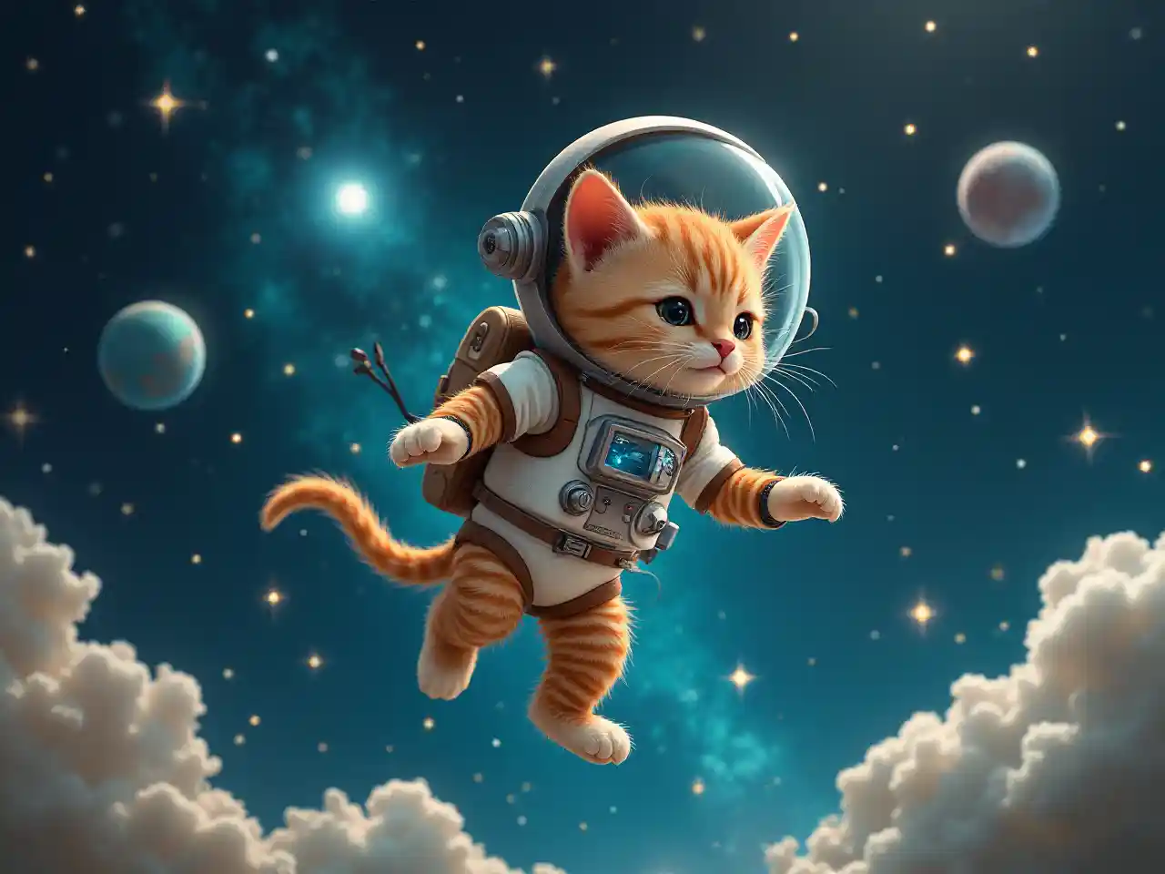 Eine skurrile Szene zeigt einen katzenartigen Astronauten, eine neugierige Katze in einem glatten Weltraumanzug, die spielerisch zwischen funkelnden Sternen und fernen Planeten durch das Universum treibt, während sie die schwerlose Freiheit des Weltraums erforscht. Dahinter verbirgt sich eine Spur von kosmischem Staub, und ein paradiesischer Traum entfaltet sich im Hintergrund.
