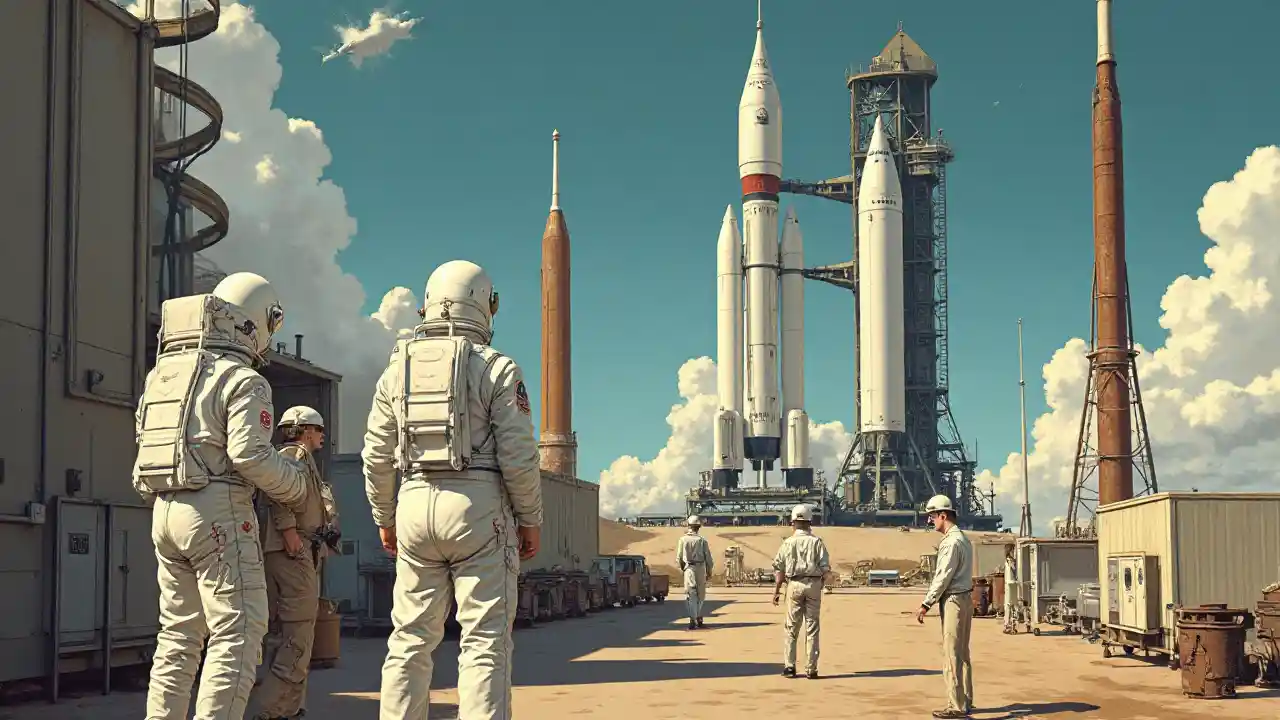 "Eine Illustration zeigt Astronauten, die sich auf den Start in einer NASA-Anlage vorbereiten, mit einer hoch aufragenden Saturn-V-Rakete im Hintergrund. Die Atmosphäre fängt die Aufregung und Nervosität der Zeit ein, Ingenieure und Wissenschaftler arbeiten fleißig. Der Stil ist akribisch und realistisch, inspiriert von den Kunstwerken der Weltraumforschung Mitte dieses Jahrhunderts. Sicherstellung historischer Genauigkeit ohne moderne Elemente