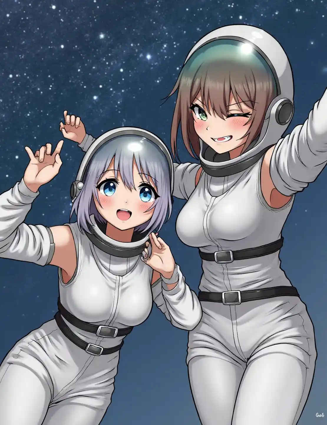 2 Mädchen, Brust, schulterfreier Raumanzug, Blick von oben, im All, Selfies
