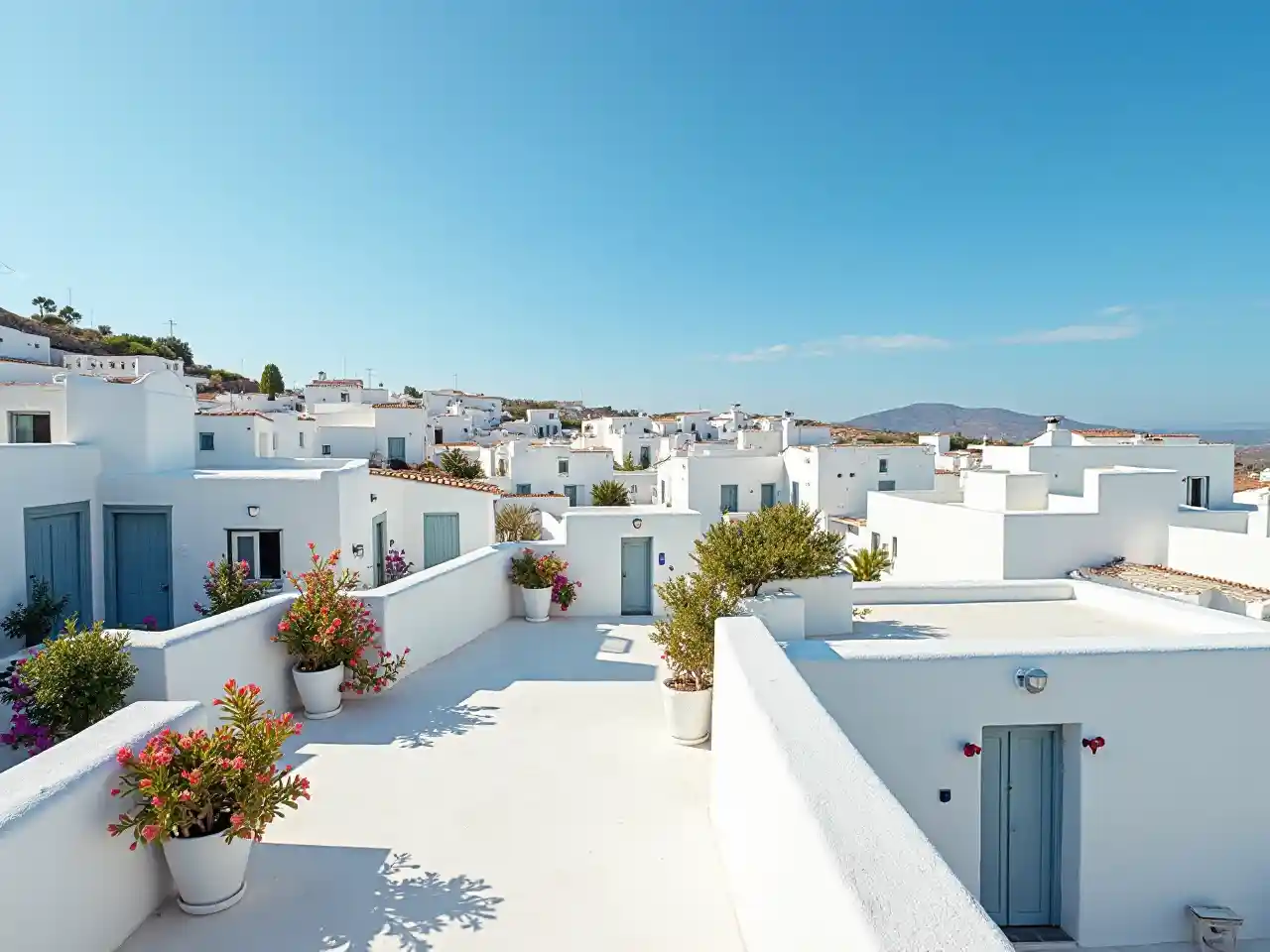 Weiße Dächer, bunte Pflanzen. Im Hintergrund die Flachdächer anderer Weißer Häuser im Stil eines spanischen Dorfes. Blauer Himmel, hohe Details. Der Blickwinkel soll wie von einem Mann fotografiert werden, der mit einer Kamera auf dem Dach sitzt und direkt zum Horizont eilt