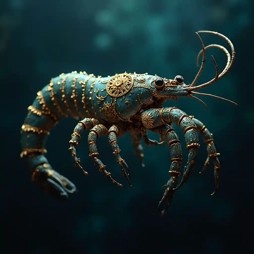 LeviBild Schöner Steampunk Einzigartige Kunstfantasie, Tiefseegarnelen im Steampunk-Stil (Sergestes similis), geschickte Steampunk-Handwerkskunst, Isolation, dunkler Tiefsee-Hintergrund,