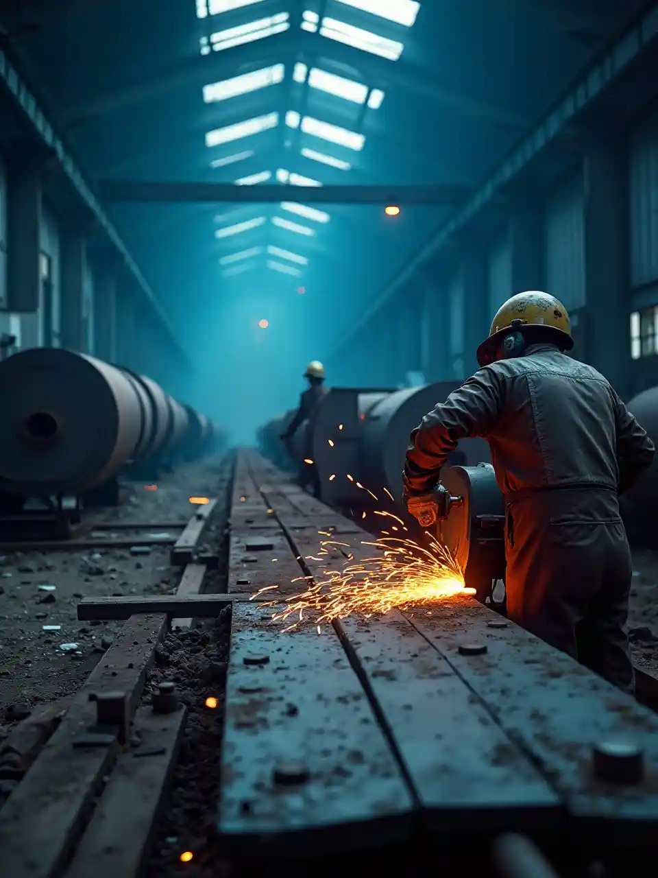 Die Fabrikszene mit geschnittenem Stahl, die hochdetaillierte Produktionskulisse, die Industriemaschinen in Aktion, die Stahlrollen im Hintergrund, ein Kombi in der Nähe stationiert, der kühle Blauton wirft das Licht der Atmosphäre, und es ist hartnäckig Die atmosphärische Atmosphäre zeigt die Kraft und Präzision der Industrie, Superdetail, atmosphärische Perspektive, 4K-Qualität.
