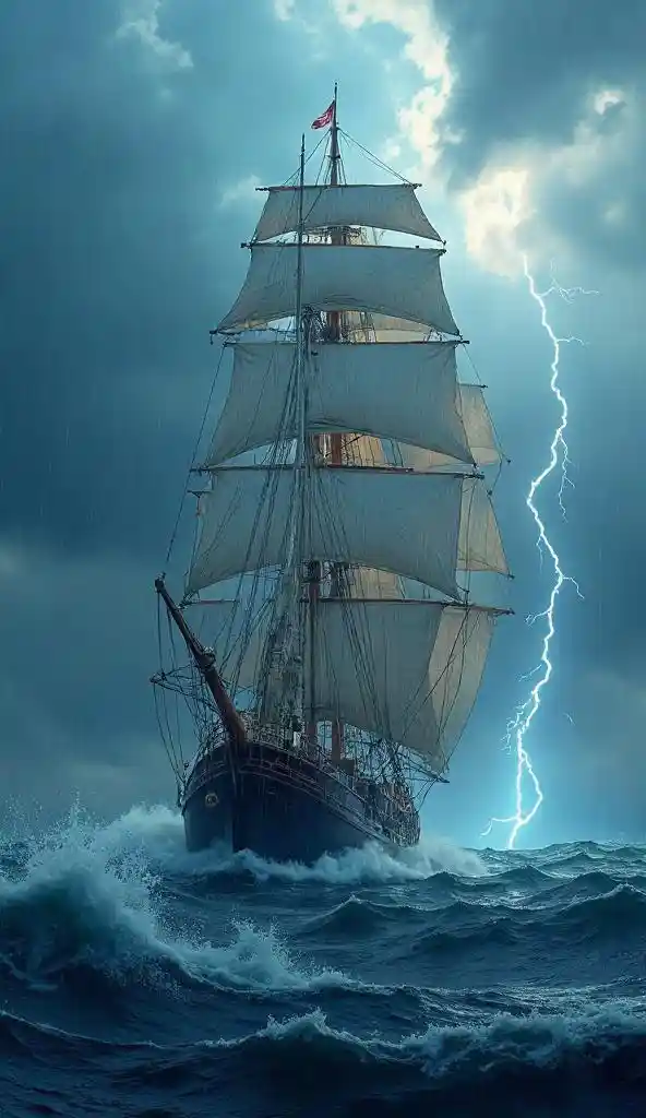 AubreyEin großes Segelboot, der Rumpf ist so groß, die Segel sind groß und luxuriös, Regenwolken am Himmel, Blitze leuchten, Regen, große Wellen, segeln durch Tours