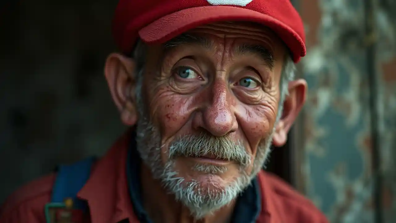 RAW-Foto, ein Porträt eines alten Super Mario, sehr detaillierte Textur, müde, runter laufen, tiefe Hautporen, rote Super Mario-Mütze, perfektes Licht, realistische Fotos, fotorealistische Fotos, harter Fokus, glatte Schärfentiefe, 8K Ultra HD, Fotos aufgenommen von Sony Alpha 1, 85mm Objektiv, f/1. 4 Blende, 1/500 Verschlusszeit, ISO100-Film, neutrale Farbe, leise Farbe