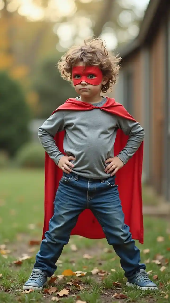 Stellen Sie sich vor, ein kleiner Junge mit zerzaustem Haar, mit Superhelden-Maske und Umhang, spielt in seinem eigenen Hinterhof. Er steht stolz und mit weit ausgebreiteten Beinen mit den Händen, bereit, die Welt mit seiner Fantasie zu retten.