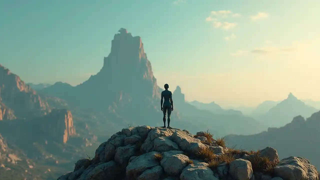 Eine surreale Landschaft, in der eine menschliche Figur auf einem Felsvorsprung steht.