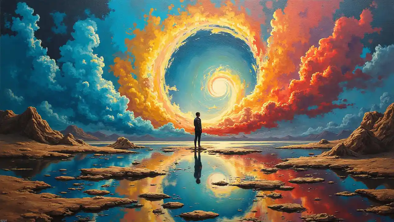 Eine surreale Landschaft, der Himmel ist ein Strudel widersprüchlicher Farben und der Boden ist ein zerbrochener Spiegel, der verzerrte Bilder von Vergangenheit, Gegenwart und Zukunft widerspiegelt. Im Chaos steht eine einsame Gestalt, deren Mimik Fassungslosigkeit und Staunen mischt. Stil: Graffiti