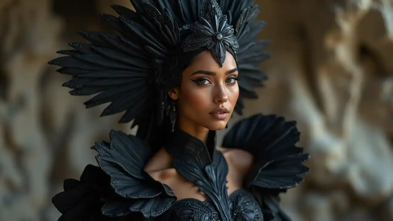 Ein bräunlich-braunes indisches Göttinnen-All-Black Fashion Future-Outfit, gepaart mit riesigem Kopfschmuck-Zentrum, sauberem Make-up, mit Schärfentiefe, verträumter Avantgarde und prächtigem Themenkleid, mit lebendiger Farbaufnahme, das die Fantasie verkörpert Essenz, Minimalismus