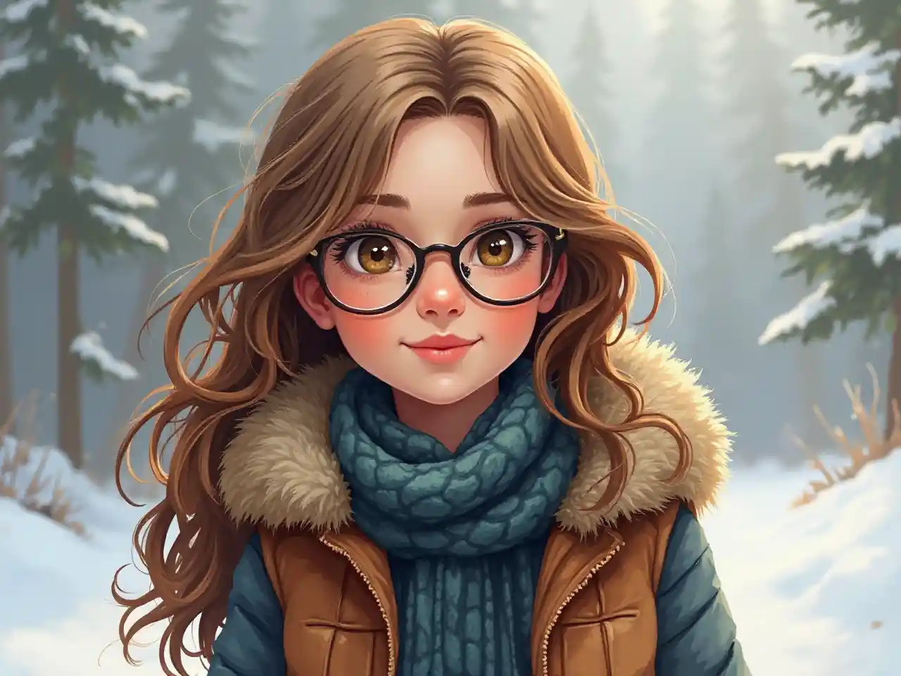 BentleySehr süße Malerei Ein Teenager-Mädchen, 14 Jahre alt, mit blassbraunen Augen und wellenförmigen, langen, braunen Haaren, Brille in einer hippen Winterweste
