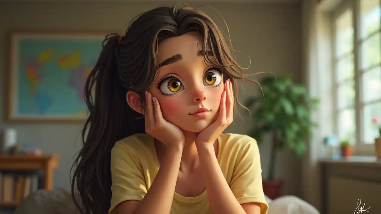 Erschaffen Sie ein brasilianisches Mädchen in einem hellen Raum, vor einem Computer, mit einer nachdenklichen Frage in ihren Augen.