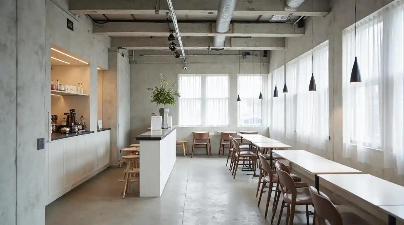 Innenraum eines modernen Blue Bottle Cafés in Tokio, Industriedecke und minimalistisch weißer Innenraum auf hellen Betonwandplatten