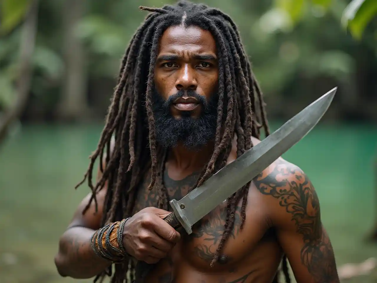 Lange geflochtene Haare, tapfere Kriegermänner, scharfe Messer-Tattoos, Vanuatu. Stammespanzerung