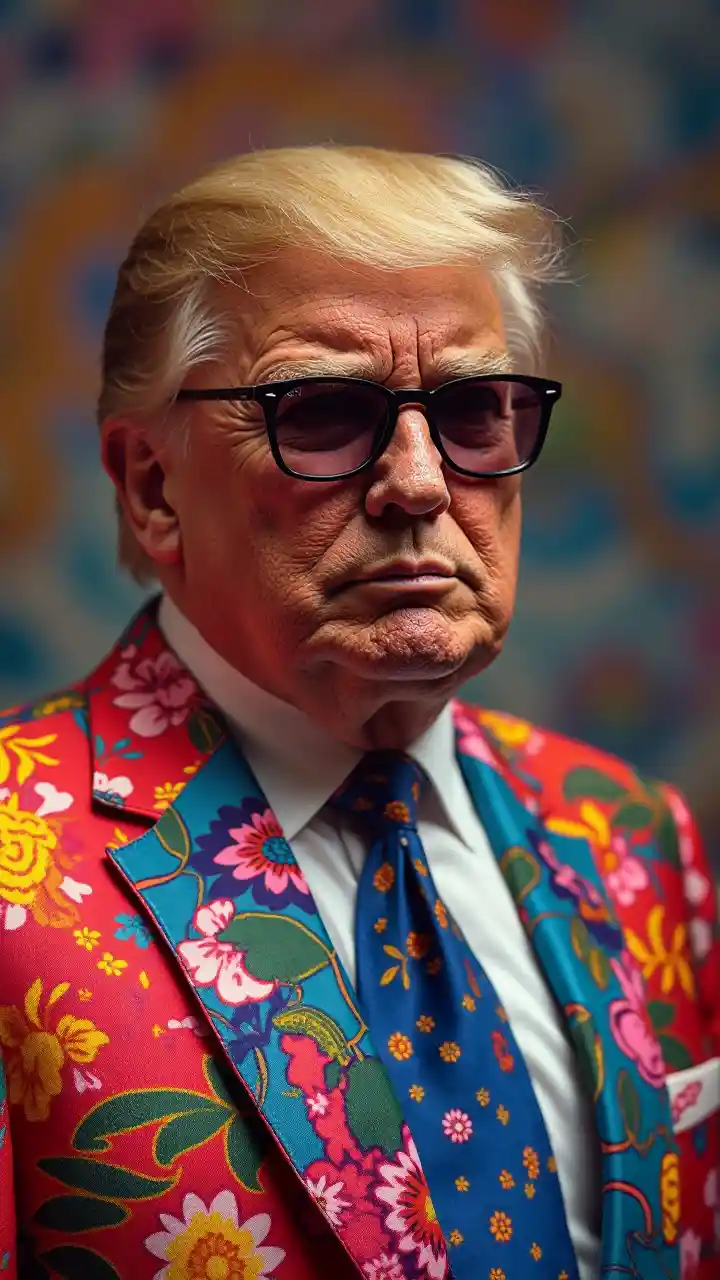 MadelynDonald Trump in knallgemusterter Jacke und Reisende Brille, lebendig gesättigte Farben, Kontrastfarben