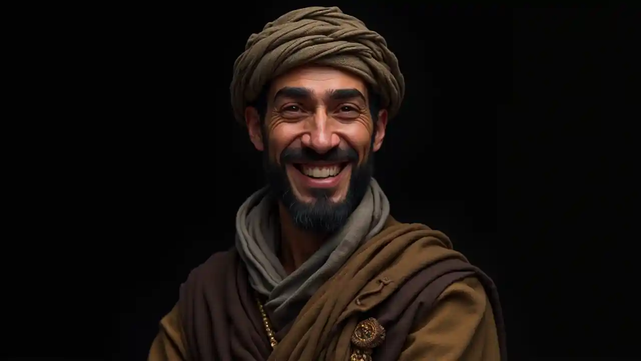 Der 50-jährige Ibnu Taymiyah sieht glücklich, schick und muskulös aus, steht aufrecht, schwarz im Hintergrund, trägt türkische Tracht und trägt ein Kopftuch.