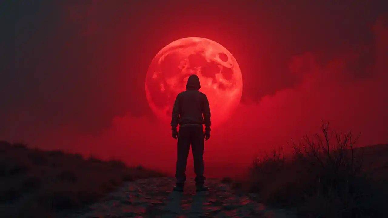 MatthewErzeugt Ultra-HD-Bilder des letzten Menschen auf der Erde aus Weitwinkelsicht, mit dunklem und rotem Motiv im Hintergrund