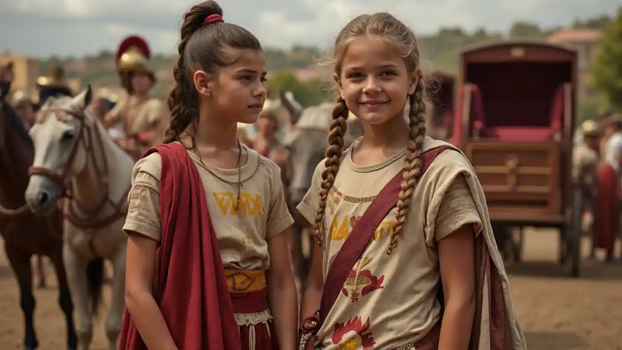 SkylarDicht nebeneinander stehen zwei Mädchen in passenden Uniformen vor einem römischen Streitwagen.