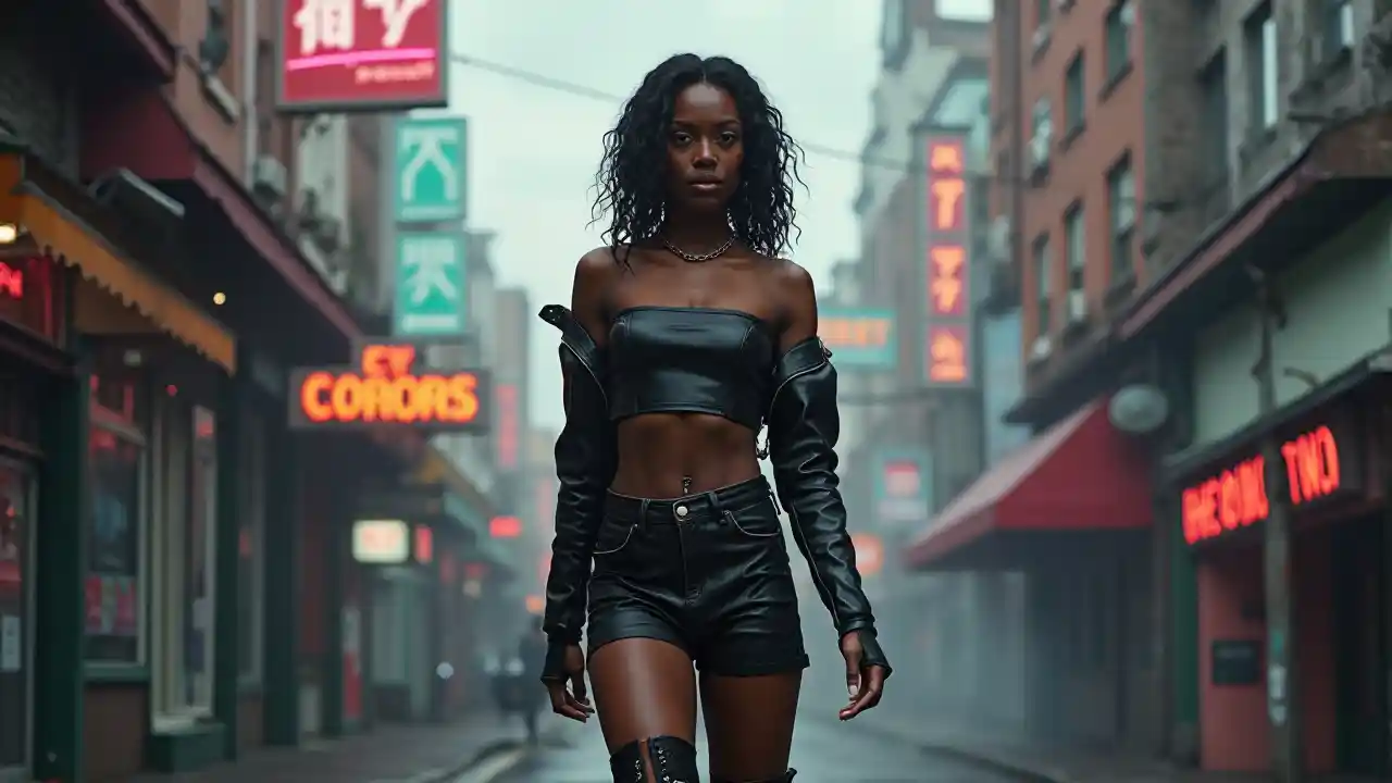 Eine 25-jährige Schwarze stolziert erhobenen Hauptes durch eine dystopische Stadt und verzaubert in einem Lederbauch-Oberteil und hohen Oberschenkelstiefeln mit Nieten. Neonschilder und verrauchte Luft umrahmten sie, ihre durchtrainierten Beine und ihr tief ausgeschnittenes Oberteil strahlten in einer zähen, futuristischen Szene rebellische Energie und urbane Sinnlichkeit aus.