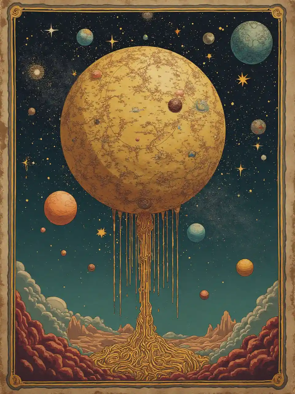 Retro-Futurist in metallischen Tönen, Astrologisches Poster, Eine Quantische Welt, die aus der Traumdimension tropft, von Victor-Jesus Escobedo