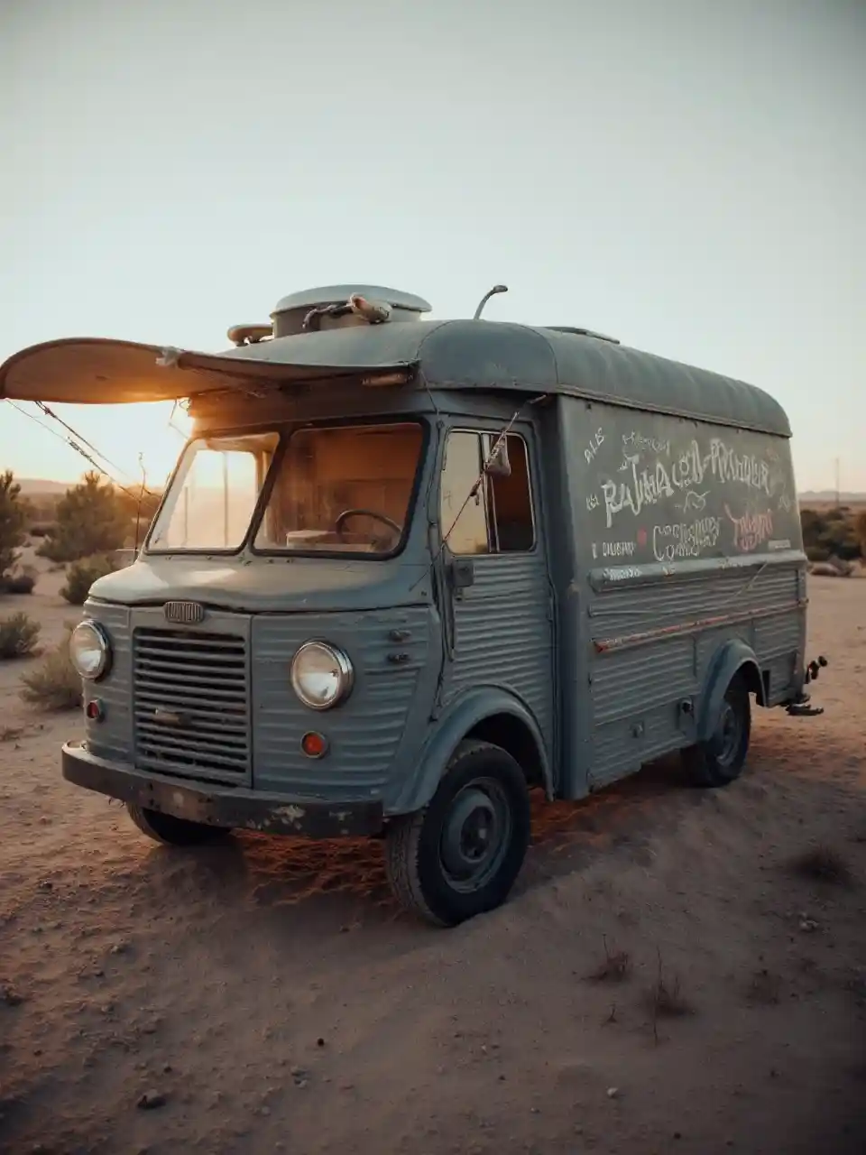 AvaDunkelgrauer Oldtimer-Foodtruck in der mexikanischen Wüste
