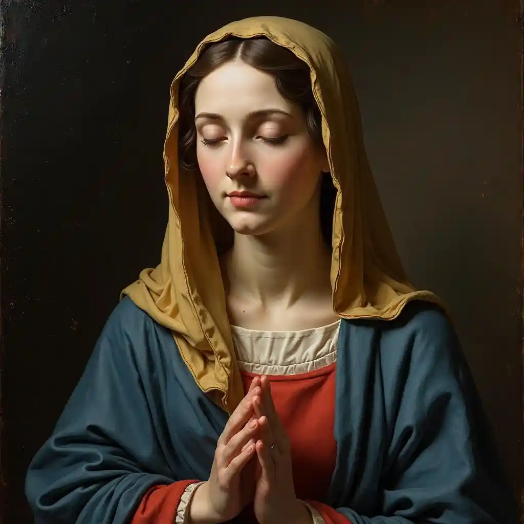 Dies ist ein klassisches Gemälde, das eine Frau darstellt, wahrscheinlich eine Vertreterin der Jungfrau Maria, da sie ein traditionelles blau-rotes Gewand trägt. Ihr Gesichtsausdruck ist ruhig, die Augen geschlossen, wenn sie gezeigt wird, vielleicht betend oder nachdenklich. Die Frauenhaare waren ordentlich geformt und trugen zudem ein gelbes Kopftuch. Licht und Schatten unterstreichen ihr sanftes Auftreten und die Textur ihrer Kleidung. Der Hintergrund ist weich und lenkt den Fokus auf ihre Figur. Das Gemälde vermittelt ein Gefühl von Stille und Spiritualität.