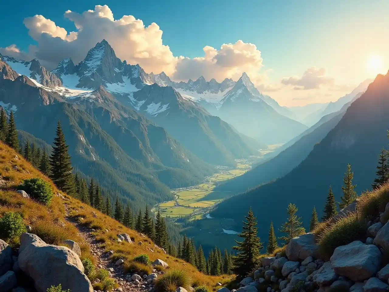 Abenteuerthematische Landschaften, atemberaubende Berge und üppige Täler, lebendige Landschaften, dynamische Wolken, die am Himmel rollen, warmes Sonnenlicht reflektiert hohe Gipfel, weckt Reiselust, spannende Outdoor-Erkundungen, lebendige Flora, weite Horizonte, faszinierende Farben, inspirierende Atmosphäre, ultradetaillierte Bilder in fotografischer Qualität, die den Betrachter in eine Welt des Reisens und Abenteuers einladen.