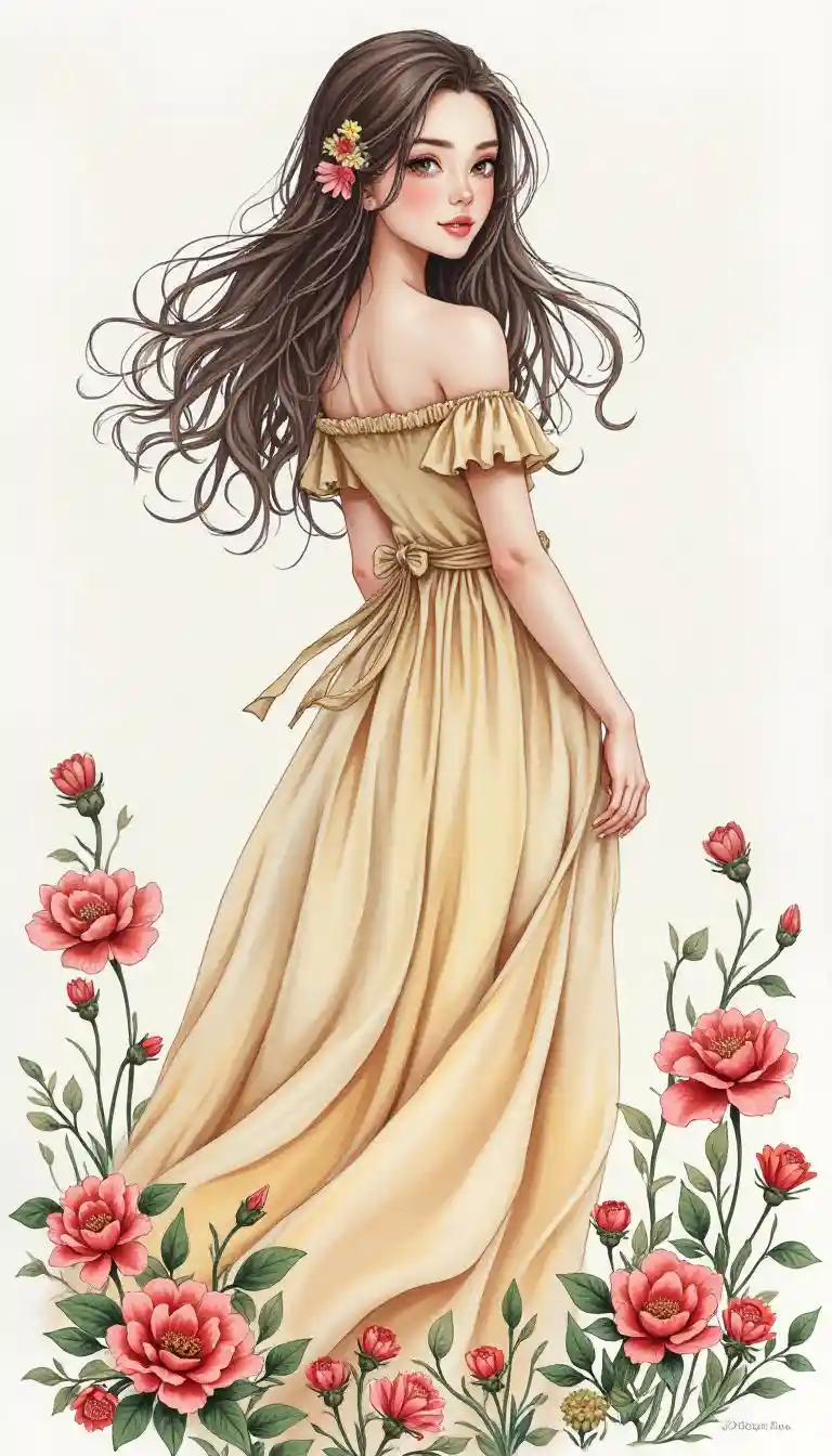 Handgemalte Textur, Aquarellkanten, dicke Linien, süßes Mädchen, sanfter Ausdruck, elegante Haltung, lange Haare, eleganter Ausdruck, Blumen, aufrecht stehen