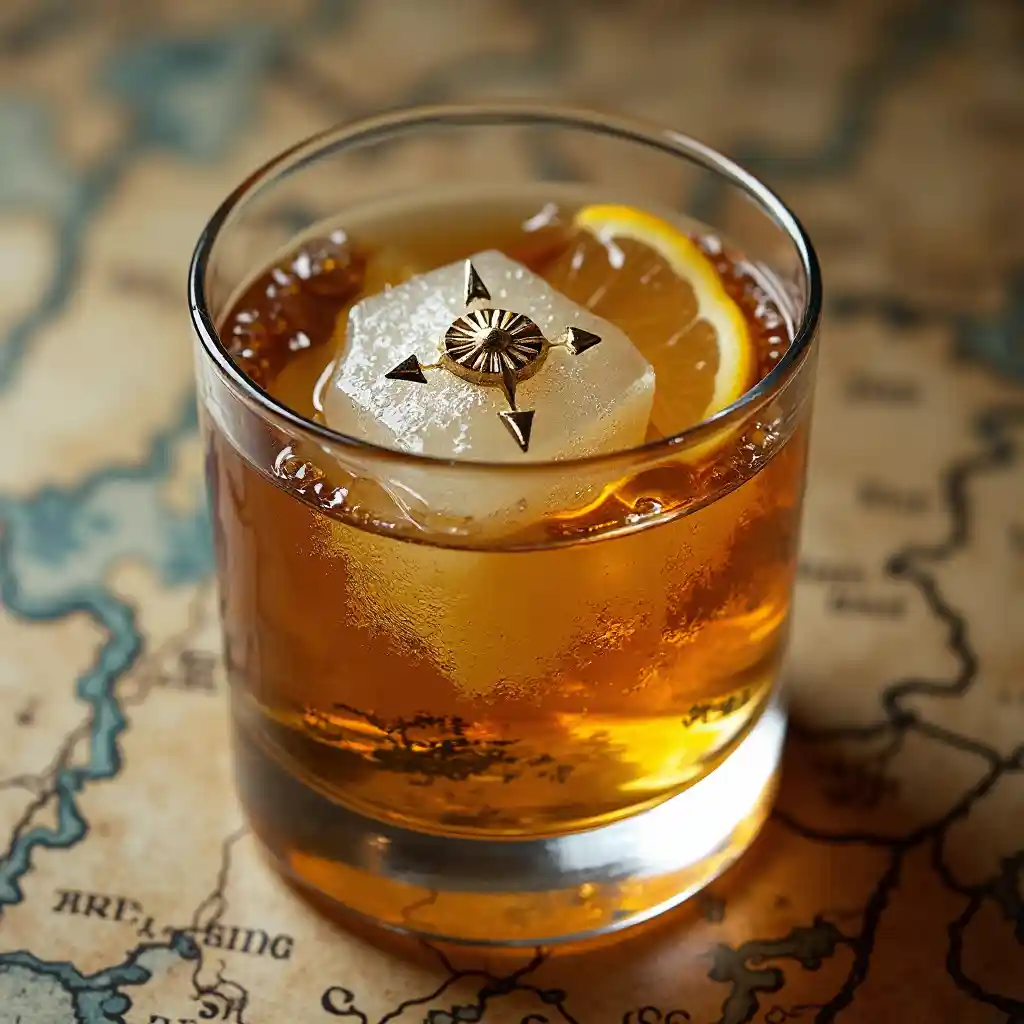 Ein säuerlicher Whisky in einem Kristallglas, seine Flüssigkeit verwandelt sich in eine Retro-Karte mit dem "Fluss" des Bourbon, dem "Gebirge" der Zitrusschalen und der mit Kompassrose verzierten Wulfzucker-Insel aus der Vogelperspektive, ultradetaillierte, weiche Erdetöne und goldenes Highlight.