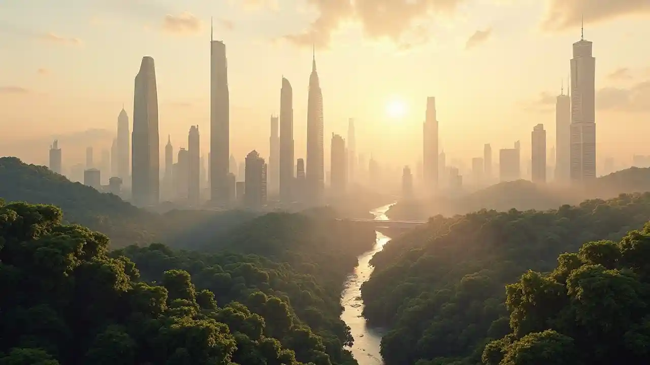 NathanDie Weitwinkelstadt der Zukunft mit Wolkenkratzern, die Stadt ist von Bäumen zu einer Mauer umgeben, die Stadt hat viele Hügel und Flüsse, das Licht soll sanft sein, es gibt Beige- und Orangetöne