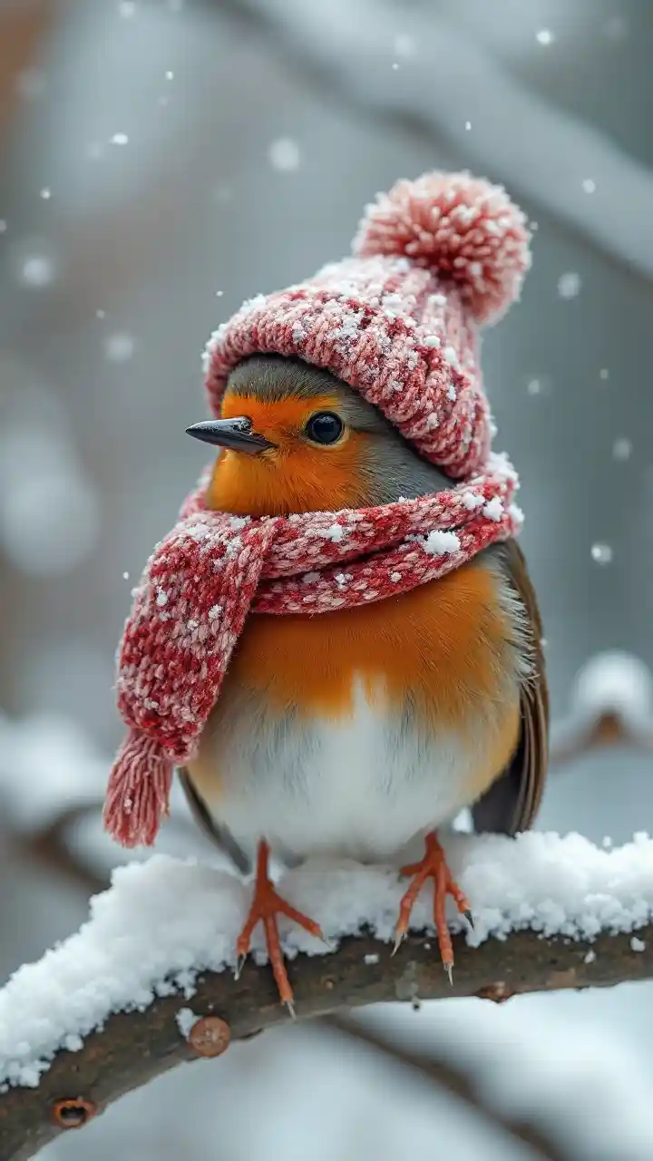 EastonEin putziges Rotkehlchen schneebedeckt mit Wollmütze und Schal auf den Zweigen, Vogelwinter Naturwild