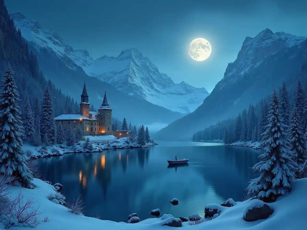 Landschaften auf der ganzen Welt Im Winter gibt es Berge, Seen, Schlösser, Nacht und Vollmond