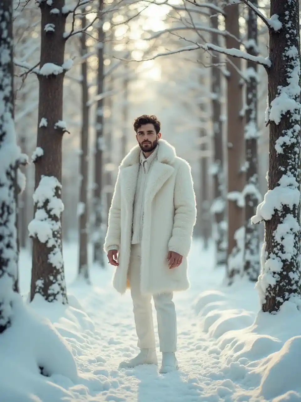 Ein dreißig Jahre alter Mann, fünf Meter groß, steht in einem beschaulichen, schneebedeckten Wald, umgeben von weißen, hoch aufragenden Bäumen. Am Boden schimmert Neuschnee, in der knackigen Luft herrscht Ruhe. Um ihn herum spiegelt der Spiegel des strategischen Layouts sein Bild aus allen Blickwinkeln wider und verleiht der Szene eine surreale und bezaubernde Qualität. Er fügt sich in geschmackvoll gekleideter, langer Felljacke aus weißem Pelz mit abgestimmter weißer Hose nahtlos in die Winterlandschaft ein. Das sanfte Sonnenlicht filtert durch die Äste, wirft warmes Licht um sich und verstärkt die geheimnisvolle Schönheit des Winters.