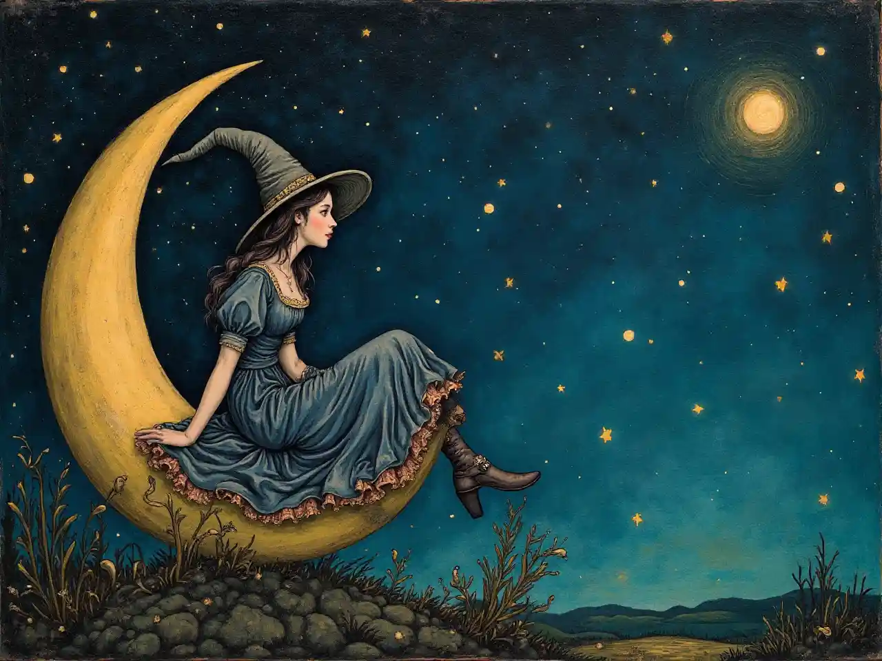 (Meisterwerk, Top-Qualität, beste Qualität, Amtskunst, ästhetische Ästhetik: 1,2), (1girl: 1,4), äußerst detailreich, eine Hexe, die auf dem Mond durch die sternenklare Nacht sitzt, eingefangen im Detail-Gouache-Stil von Hieronymous Bosch,