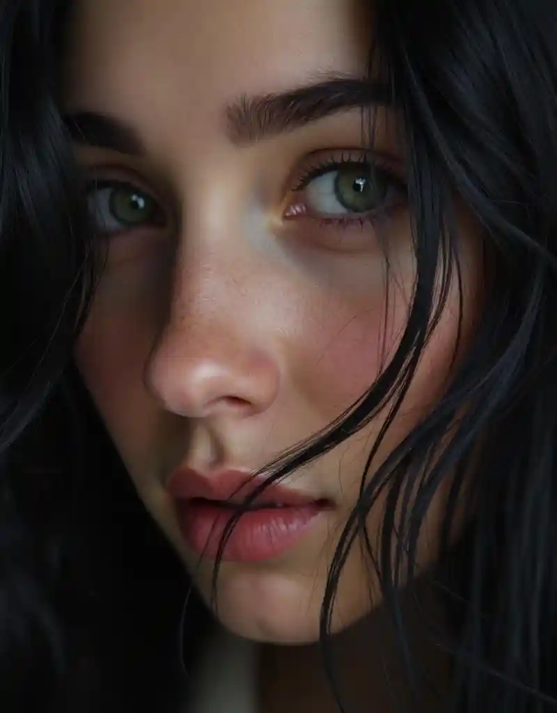 Hochdetaillierte und realistische ultimative Nahaufnahme, eine junge Frau, die lebensecht, aber natürlich aussieht, mit langen, eleganten schwarzen Haaren, die sanft einen Teil ihres Gesichts bedecken.