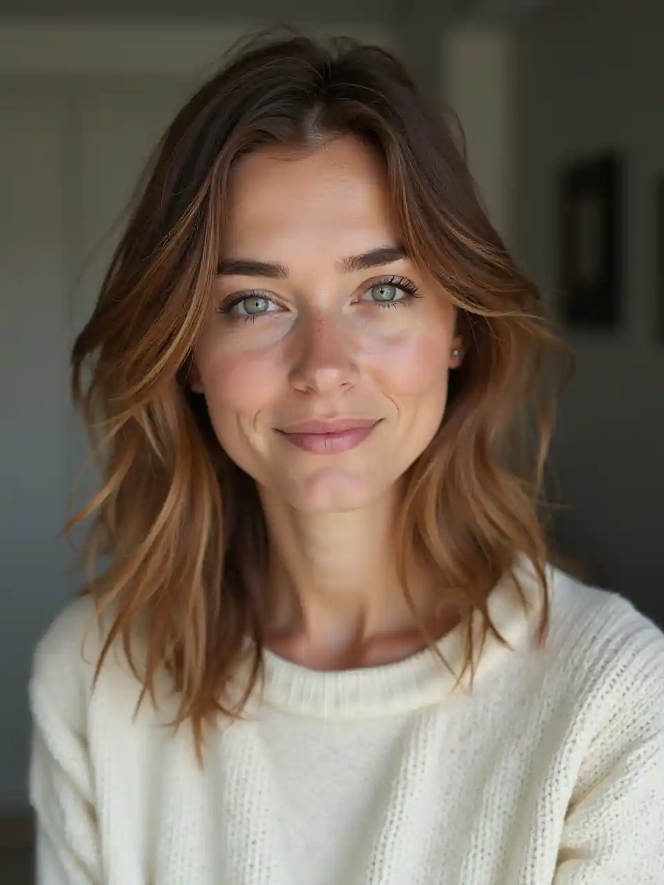 Eine 40-jährige Frau trägt einen weißen Pullover mit braunen Haaren und einer Büste.