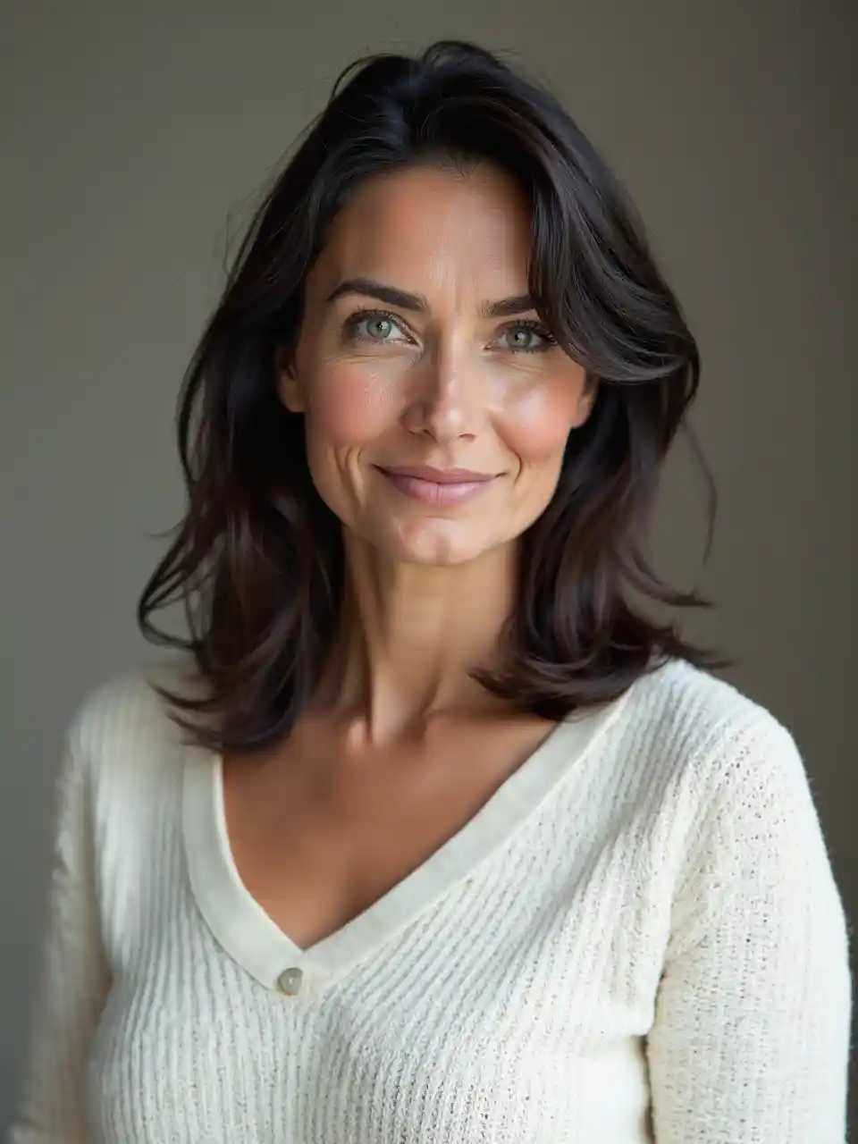 AdelineEine 40-jährige Frau trägt ein weißes, gebräuntes, glattes Haar und trägt einen weißen Pullover mit einer Nahaufnahme der Büste.