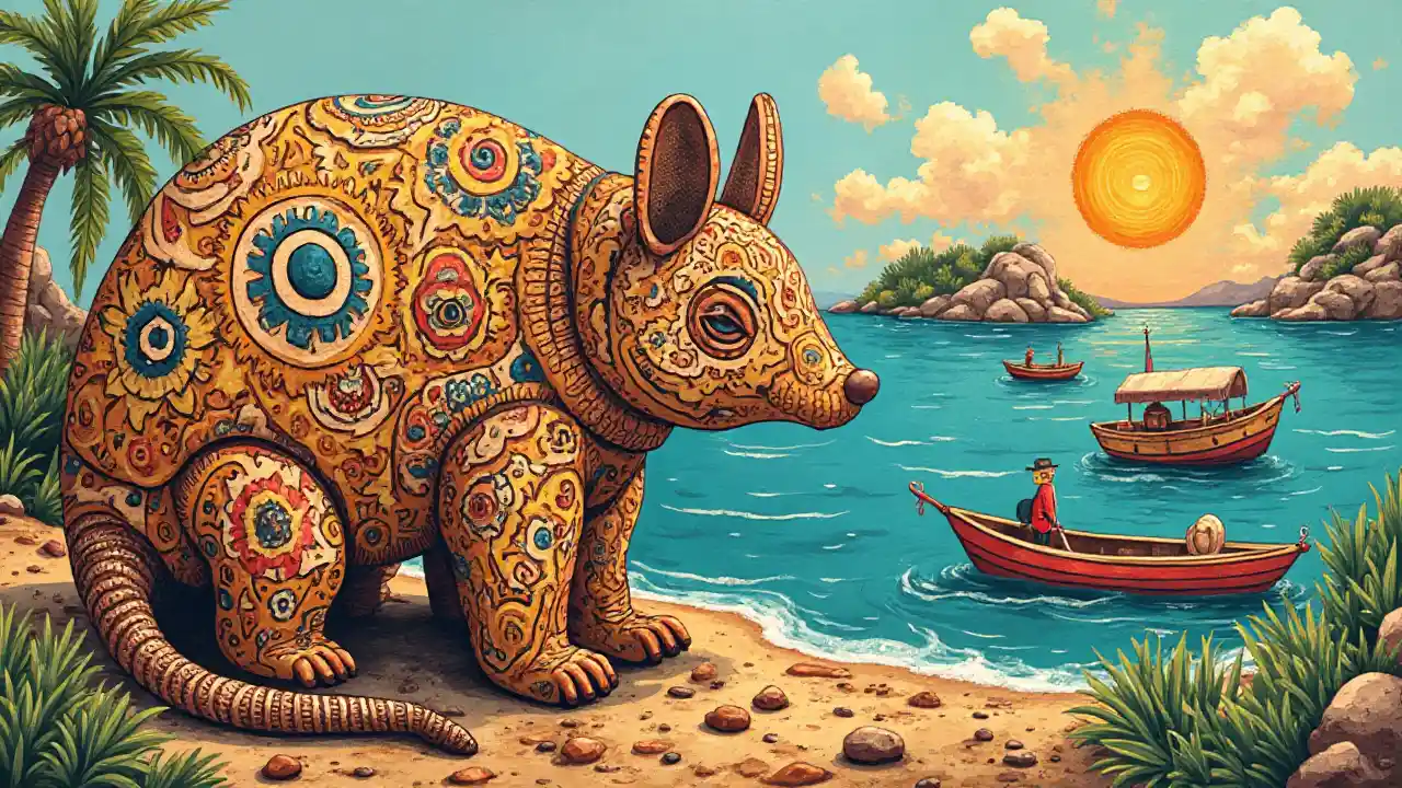 Emmailustraci ó n fullcolor de artesan í a precolombina colombiana tallada en madera que parece un armadillo junto con un mar de maracas de madera