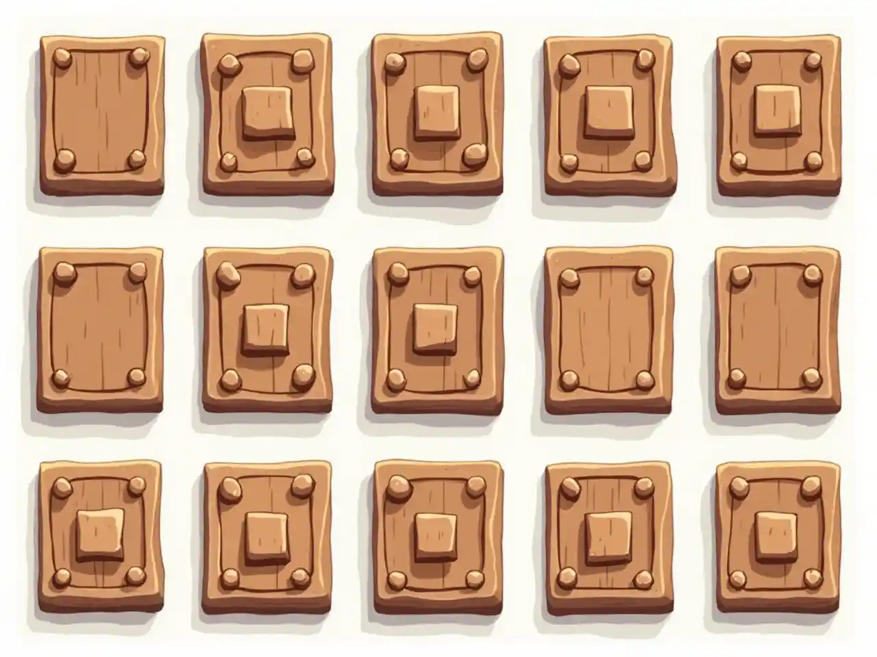 Für Videospiele wird eine große Gruppe von Holztafel-Ikonen mit quadratischen Beulen, Einkerbungen und quadratischen Rundsiegeln verwendet. Die Fliesen sollten auf reinem weißem Untergrund in Rastern organisiert sein, damit sie integriert werden können, und jede Überlappung sollte vermieden werden. Das Gesamtdesign sollte auf Klarheit und visuelle Attraktivität achten und für die Spielumgebung geeignet sein.