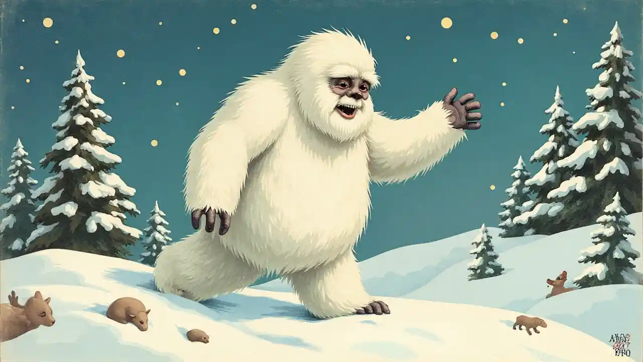 Yeti, der verdammte Schneemann, Illustration einer Retro-Weihnachtspostkarte