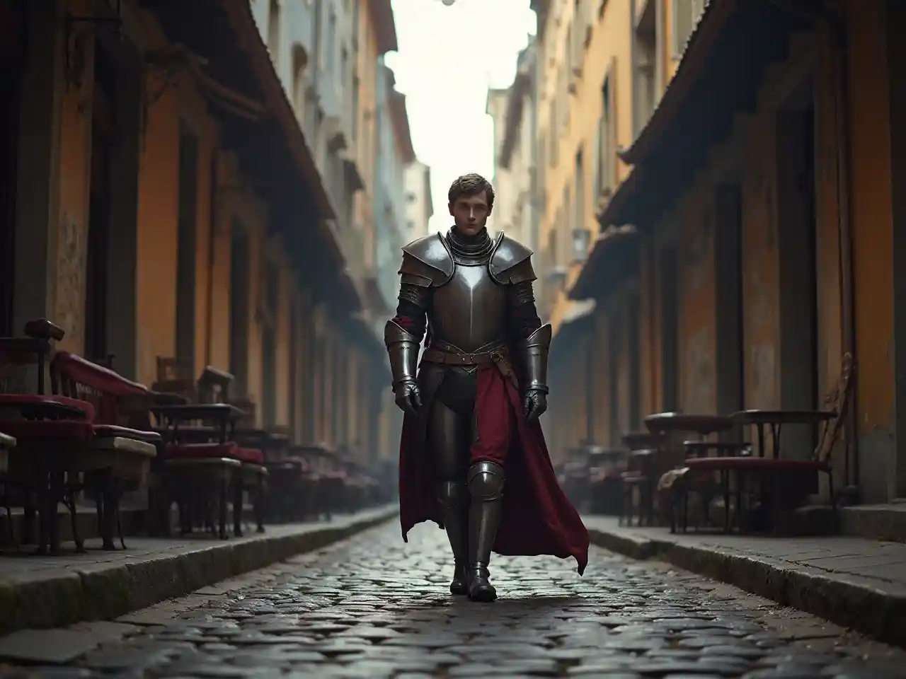 Der hochgewachsene junge Ritter ging auf der Straße, beleuchtet